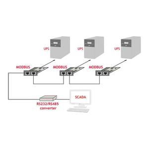 A placa Modbus permite a comunicação entre várias UPSs e o sistema anfitrião (por exemplo, SCADA) através do bus RS-485. Cada UPS está equipada com uma placa Modbus dedicada, que fornece uma interface de comunicação. Os dados são enviados dos dispositivos para um computador através de um conversor RS232/RS485 para posterior processamento e análise em tempo real.